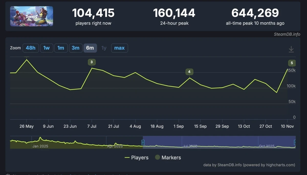 Впервые за пять месяцев пик онлайна Marvel Rivals в Steam вырос до 160 тысяч
