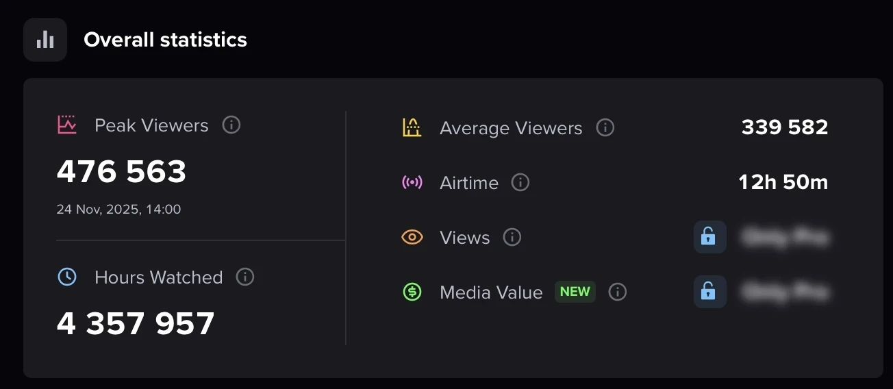 Статистика также показала распределение интереса по языкам: англоязычные стримы в пике смотрели почти 194 тысячи человек, а русскоязычная трансляция собрала около 108 тысяч зрителей. Эти показатели подтверждают колоссальный интерес к StarLadder Budapest Major 2025, который проходит в Венгрии с 24 ноября по 14 декабря и где разыгрывается 1,25 миллиона долларов.