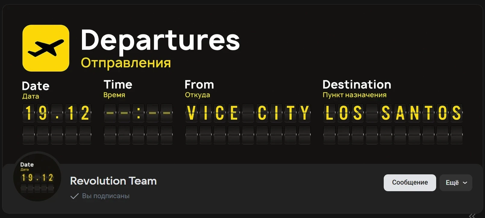 Вероятно, им станет перенос Grand Theft Auto: San Andreas на движок RAGE или другое «переиздание». Оформление сообщества Revolution Team показывает табло аэропорта. Рейс из Вайс-Сити в Лос-Сантос (один из городов штата Сан-Андреас в 3D-эпохе GTA) отправляется уже 19 декабря. Видимо, тогда энтузиасты и представят свой новый проект.