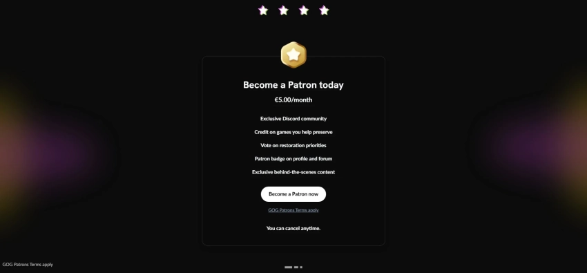 Магазин призвал всех, кому «не плевать» на сохранение видеоигр, оформлять платную подписку GOG Patrons за пять евро в месяц (около 450 рублей в момент написания новости). За эту сумму игроки получают возможность смотреть эксклюзивный контент на закрытом Discord-сервере, особый значок профиля и шанс увековечить свой псевдоним на страницах GOG Preservation Program.