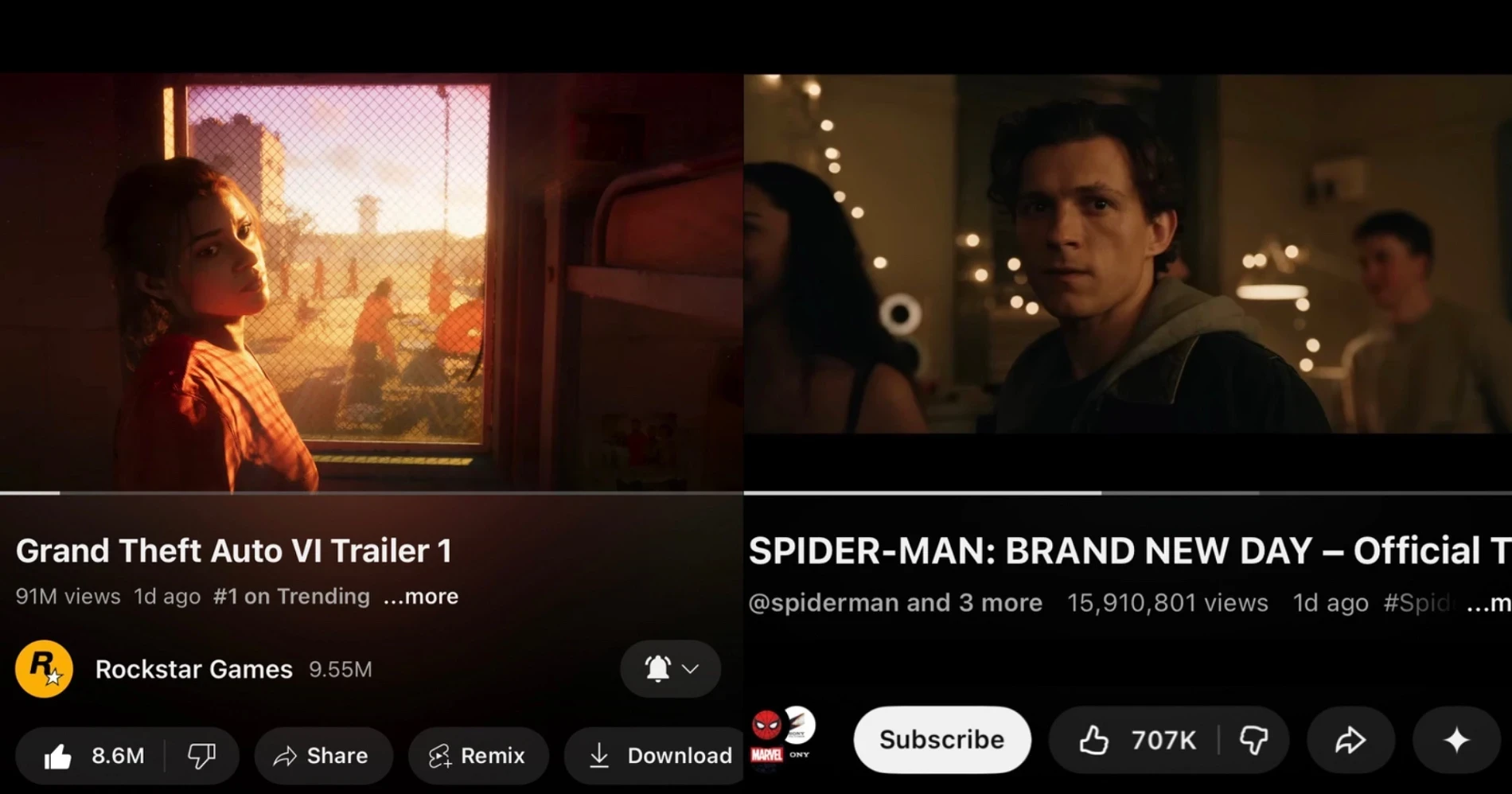 • Grand Theft Auto VI: 91 млн просмотров и 8,6 млн лайков.