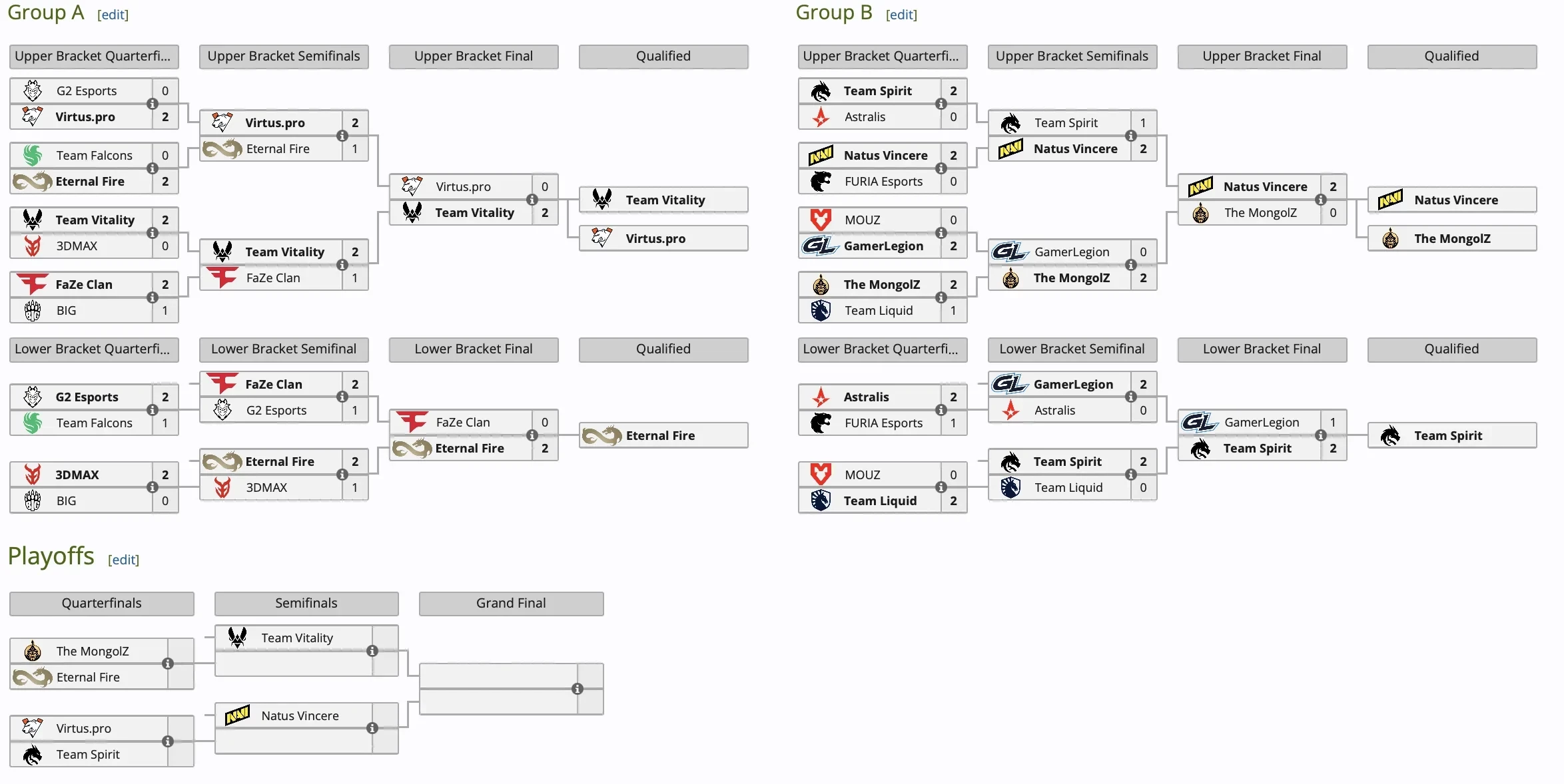 Теперь о плей-офф. В четвертьфинале сыграют The MongolZ и Eternal Fire, Virtus.pro и Team Spirit. Затем победитель первой пары сыграет с Team Vitality, а победитель второй с Natus Vincere. Нокаут-стадия начнется 7 февраля.