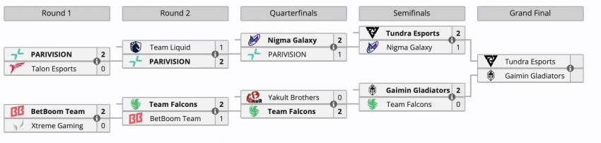Накануне Tundra Esports2 обыграла Nigma Galaxy со счетом 2:1, а Gaimin Gladiators выбила из борьбы Team Falcons — счет 2:0. Проигравшие команды разделили 3-4 место и заработали по 60 тыс долларов.