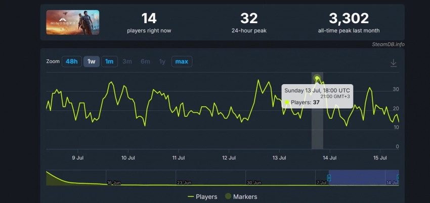 Пока скидка не смогла вызвать всплеска аудитории MindsEye. За последние 24 часа на пике в Steam в игре находилось лишь 32 игрока. В целом же наибольший пик боевика в июле пришёлся на начало месяца — в игре находилось 54 геймера одновременно. А за прошедшую неделю рекорд составил лишь 37 человек воскресным вечером.