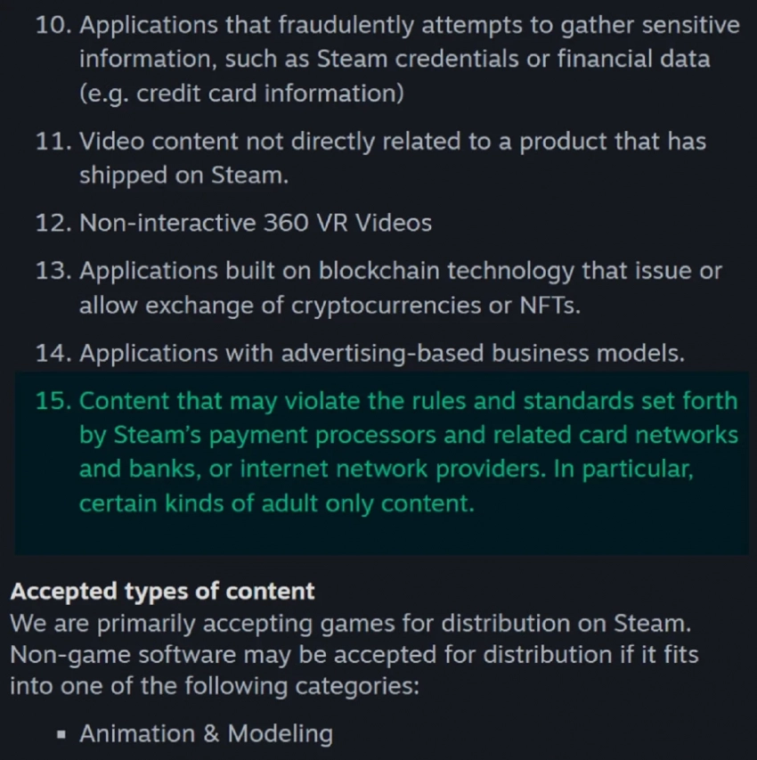 «Запрещён контент, который может нарушать правила и стандарты, установленные платежными системами Steam и связанными с ними сетями [банковских] карт и банками, а также интернет-провайдерами. В частности, некоторые виды контента только для взрослых», — новое ограничение Steam.
