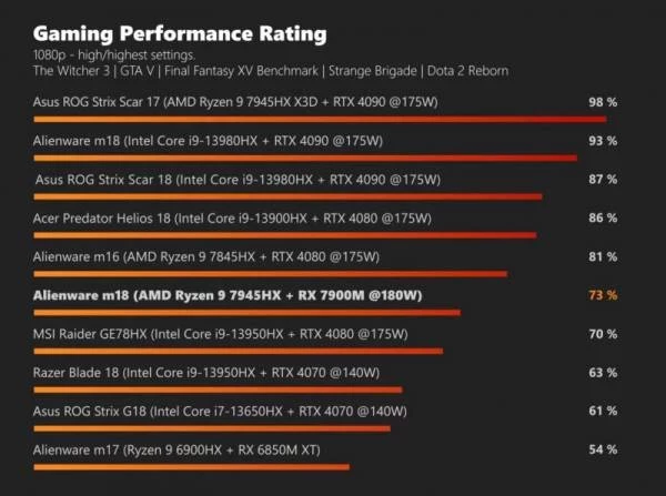 Компания AMD в прошлом месяце представила флагманскую мобильную игровую видеокарту Radeon RX 7900M, а также первый ноутбук, который ею оснащён — Alienware m18. Последний также получил флагманский процессор Ryzen 9 7945HX с 16 ядрами и 32 потоками. Портал Notebookcheck заполучил это устройство и провёл первые игровые тесты. Новинка показала весьма высокую производительность, но посредственную автономность.