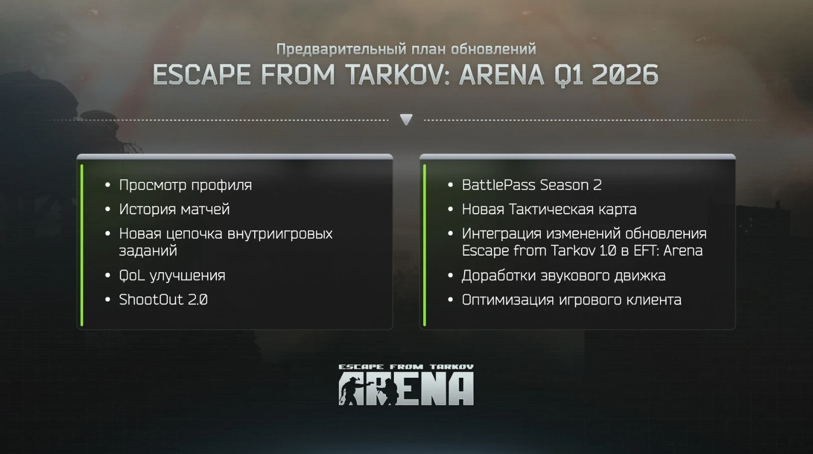 Если говорить про контент, в Escape From Tarkov: Arena прибудет новая цепочка заданий. Также шутер пополнится боевым пропуском второго сезона и новой тактической картой. А ещё студия Battlestate Games интегрирует в «Арену» изменения, которые появились в релизной версии оригинальной Escape From Tarkov. Напомним, что она вышла в ноябре.