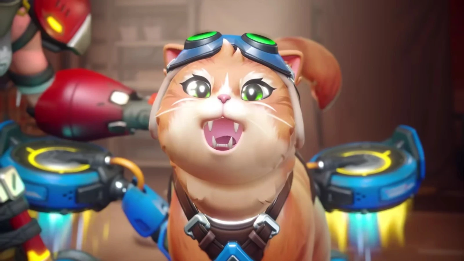 Первым в ролике показали Фику — котика с джетпаком (поддержка). Очаровательный пушистик стреляет из бластеров при помощи разноцветных кнопок. Напоминает видео, где кошки нажимают похожие кнопочки, чтобы попросить еды или почесушек.