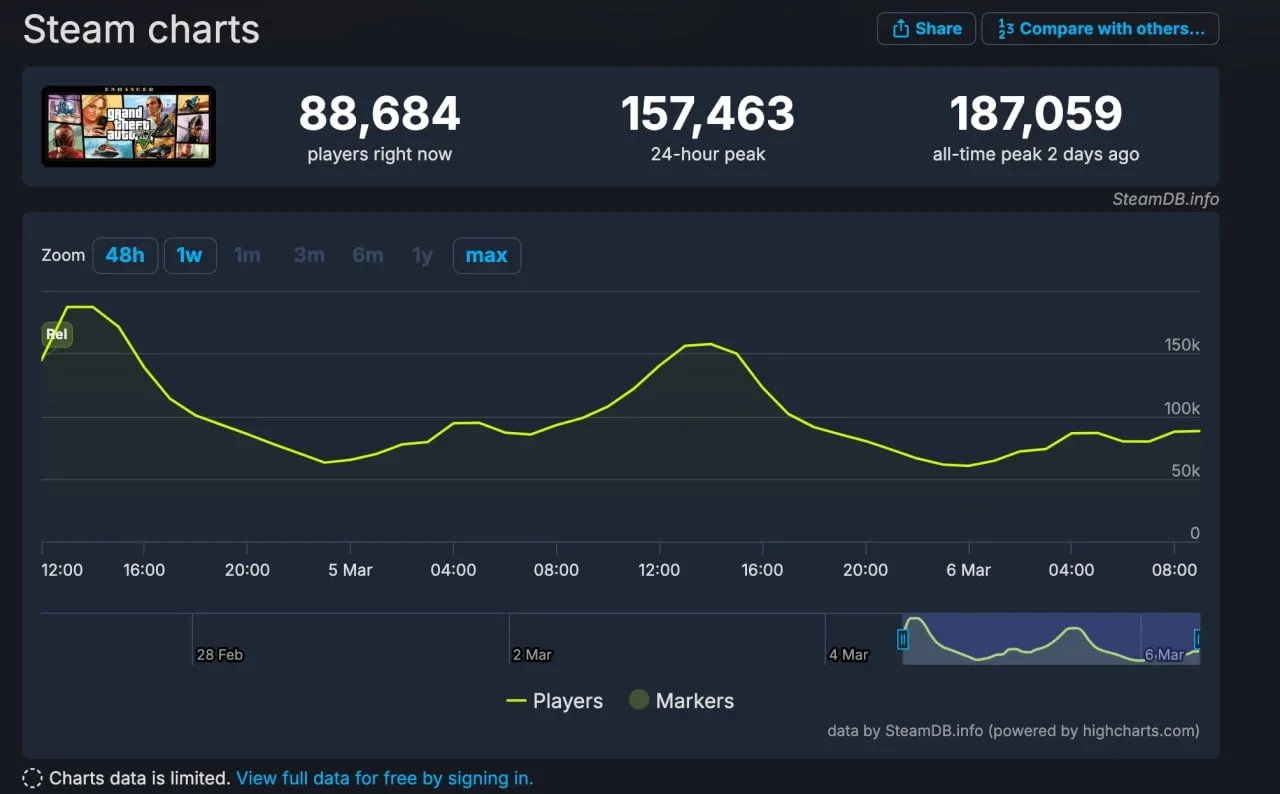 Если сравнивать с обычной GTA 5, то её пик онлайна за последний день перевалил за 120 тысяч, а сейчас игра привлекла почти 68 тысяч человек.
