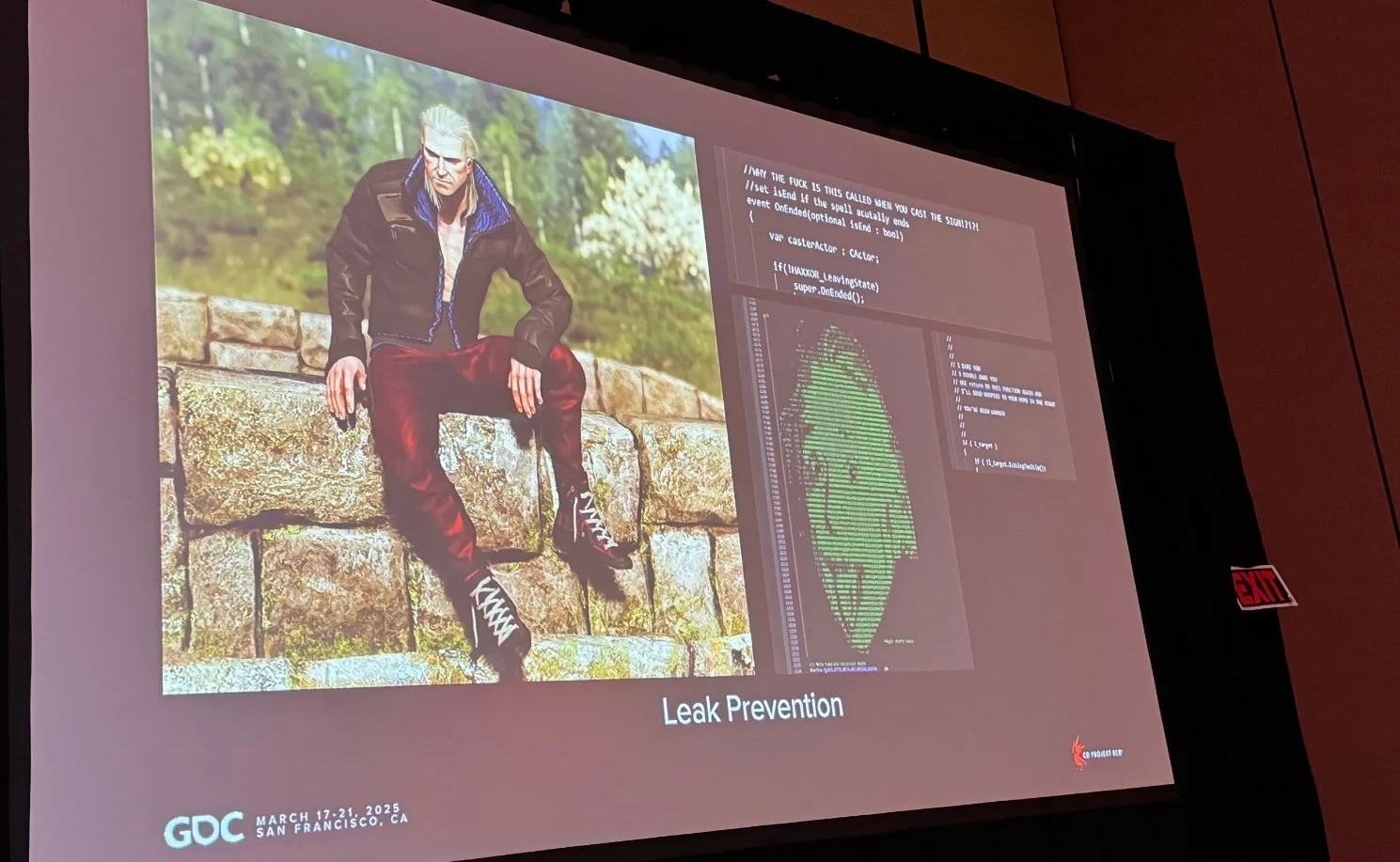 «Некоторые примеры, которые мы нашли, — это Геральт в куртке в стиле киберпанка, ASCII-арт, переписывающий код, и некоторые сообщения дизайнеров, спорящих, как правильно написать игровой код в самом движке. Таким образом, мы не знали, что можем найти, и нам действительно нужно быть осторожным, потому что мы могли пропустить что-то, что не хотели показывать публике», — рассказал Хамбалко.